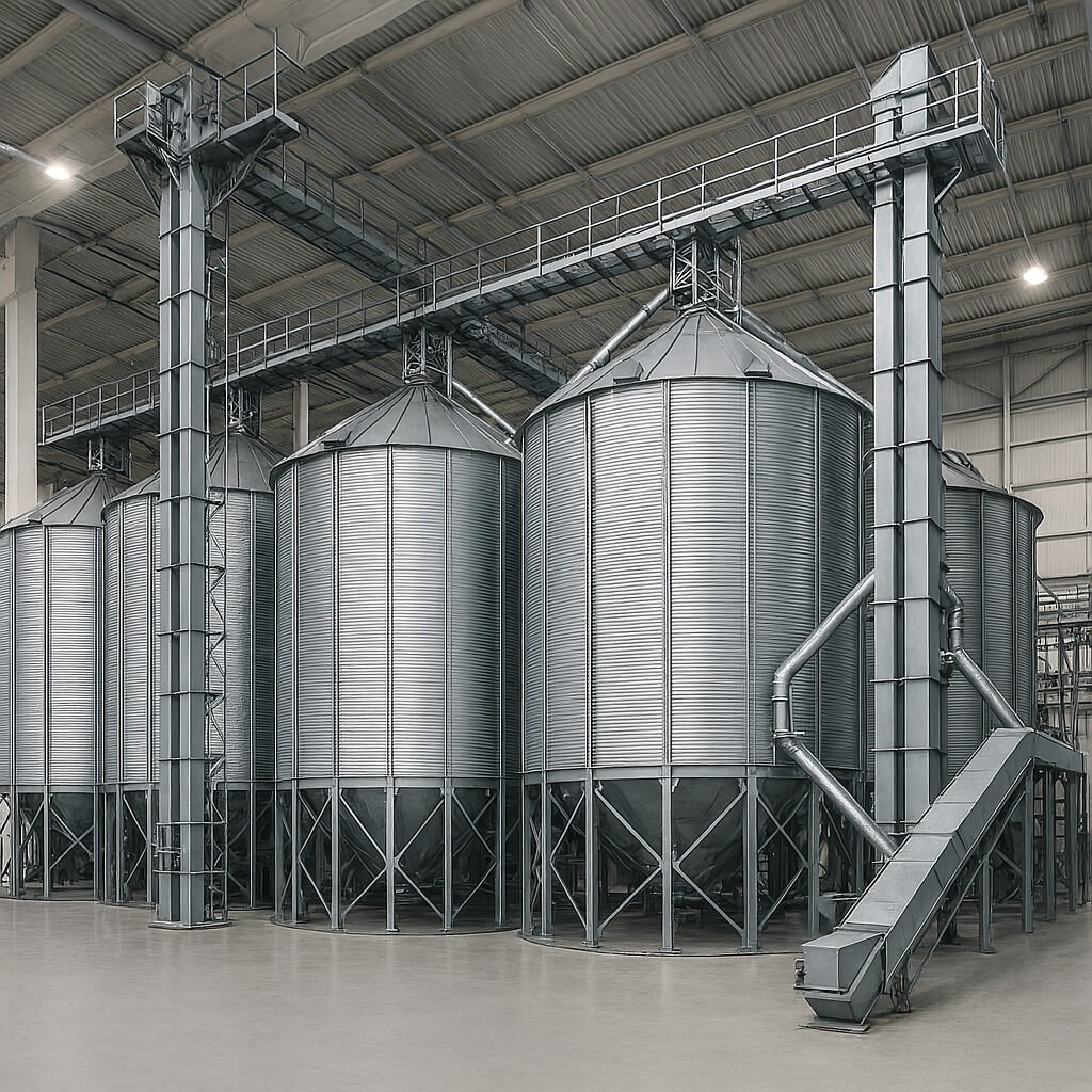 GI silos with hoppers, elevators, distributors, and aeration systems for total